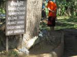 Prior to 1975, Choeung Ek was an orchard and graveyard, but became a final resting place as prisoners were executed. In that process, prisoners were forced to perform the most hideous of acts, including the beating of children against trees (see left). Presently, bones and tattered clothing seep up from the ground during heavy rainfall (see right).